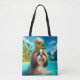 Escape to paradise with this vibrant canvas tote featuring Magnum the Shih Tzu in a stunning tropical setting. With lush green mountains, swaying palm trees, and crystal-clear waters as the backdrop, Magnum shines in his island-inspired topknot adorned with vibrant leaves and a bright orange flower.