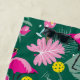Super funny tropical pickleball party with pink flamingos, drinks and tropical foliage. on dark green background