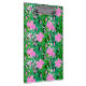 Vector seamless floral pattern with tropical decor: big pink flowers on background of palm leaves silhouettes, bushes, branches and jungle foliage © and ® Bigstock® - All Rights Reserved.