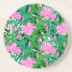 Vector seamless floral pattern with tropical decor: big pink flowers on background of palm leaves silhouettes, bushes, branches and jungle foliage © and ® Bigstock® - All Rights Reserved.