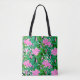 Vector seamless floral pattern with tropical decor: big pink flowers on background of palm leaves silhouettes, bushes, branches and jungle foliage © and ® Bigstock® - All Rights Reserved.