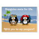 They say that penguins mate for life. “Will you be my penguin?” is an infinitely cute and loveable way to propose. For the tropical island-loving couple! A cute pirate penguin with red bandanna, sword and parrot is with a pretty hula penguin in grass skirt and colourful flowers. They are on a beautiful beach. Waves lap onto shore while coconut trees dance in the ocean breeze. Customise the penguin bandanna and skirt with your initials. If you like, replace the "Penguins mate for life. Will you be my penguin?" sample text with your own. Perfect for wedding proposals, engagements and anniversaries.