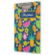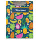 This is custom name personalised clipboard featuring cute vibrant colourful tropical fruits with pineapple, papaya, dragon fruit, mango, banana, watermelon, and lemon with tropical leaves on dark background