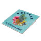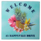 Tropical pineapple and flowers welcome house tile, with address. Pineapples, hibiscus, plumeria and bird-of-paradise flowers decorate the centre of this ceramic square tile. Aqua blue background with curved "welcome" text at the top and template for street address at the bottom.