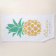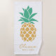 Tropical Pineapple Custom Name Beach Towel features a stencil styled yellow and green pineapple over a light yellow background. Personalise it with your first and last name in a stylish script font.