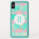Tropical trendy pineapples patterned pink flamingos and sea green monogrammed phone case.