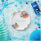 Celebrate the joy of your ropical bridal shower with this personalised paper plate, adorned with a captivating sunglasses and a sun hat motif. Against a backdrop of crisp white, vibrant pink hibiscus flowers and green leaves, evoke the enchanting ambiance of a sun-kissed beach paradise. Each plate exudes chic sophistication, perfectly complementing the tropical theme of the occasion. Whether you're indulging in delectable treats or mingling with loved ones, these plates effortlessly elevate the atmosphere, adding a touch of elegance to every moment. Perfect for a beach bridal shower party or picnic.