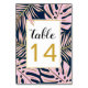 Pink tropical leaves with gold outline navy blue wedding table numbers card. This lovely tropical design features leaves of Split Leaf Philodendron (Monstera deliciosa) or Swiss Cheese Plant and palm leaves in blush pink with gold outline on navy blue. Put your text is in the white frame with gold outline.