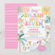 Make a splash with this colourful tropical pool party birthday invitation, perfect for kids celebrating a summer milestone! Featuring playful illustrations of ice cream, popsicles, watermelon, flamingo floats, palm trees, and sunshine, this design sets the tone for a fun-filled celebration. The vibrant pastel colours and whimsical fonts create a cheerful, beachy vibe that guests will love. Ideal for pool parties, summer birthdays, or tropical-themed events, this invitation is both stylish and festive.