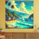 This artwork captures a serene Okinawan coastal scene in a dreamy, lofi-inspired style. The golden beach is lined with rustic seaside houses, tall palm trees, and a wooden pier stretching into the turquoise waves. Sailboats drift lazily across the water, while the background features lush green mountains, a distant bridge, and a glowing sunset sky with fluffy clouds and a crescent moon. The soft, nostalgic lighting and vibrant yet calming colours create a peaceful, relaxing atmosphere perfect for a lofi aesthetic.