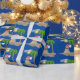 Christmas lights on a palm tree with bright sunshine through white fluffy clouds on a blue background.