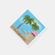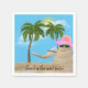 Cute tropical sandman wearing sunglasses and pink sun hat in beach sand with hammock and palm trees.