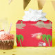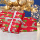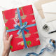 Christmas lights on palm tree with bright sunshine through white fluffy clouds on red background.