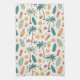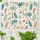 Bright tropical pattern kitchen towel featuring palm trees, surfboards, citrus slices, flip flops, and fruity drinks in a fun summer-inspired style. Ideal for beach lovers, surfers, vacation fans, and anyone who loves colorful tropical aesthetics.