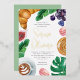 Invite guests for an elegant summer bridal shower brunch with these beautiful watercolor invitations. Design features your celebration details in modern lettering with gold foil accents, surrounded by illustrations of breakfast pastries, croissants, macarons, coffee, and lush tropical greenery with banana leaves and a monstera leaf.