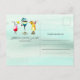 Three summer cocktails decorate the top of this summer cocktail party invitation. The cocktail on the left is pink with a yellow umbrella. The cocktail on the right is yellow and garnished with a cherry and pineapple slice. A turquoise drink, with blue umbrella takes centre stage. A soft blue watercolor wash provides the perfect background for both the front and back of your cocktail party invitation. Summer Fun is written in a whimsical font. Your party details follow. The postcard back as the same cockatils and blue watercolor wash and a place for you to write a personal comment.