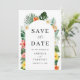 An elegant wedding save the date in tropical summer theme featuring hand painted watercolor palm leaves, banana leaves, hibiscus, plumeria, and a lovely photo of the couple at the back.