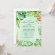 Long distance baby shower by mail invitation with elegant handwriting typography featuring abundant tropical greenery, strelitzia flowers, a flamingo and a gold geometric frame.