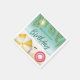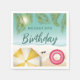 Make birthday celebrations bright with these beach-themed paper napkins designed by Destei. Light teal waves meet sandy shore while tropical palm leaves and a peek of sun frame the scene on the top. On the sand, a yellow striped beach umbrella, pink swim ring and black sunglasses add playful summer vibes. The center has space to write custom text.
