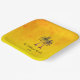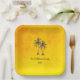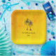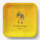 Tropical Bright Gold swim party paper plate, with a palm trees illustration design and black customisable lettering. Great for planning your summer picnic party with a beach theme.