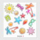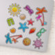Summertime scrapbook stickers. Each sticker is shaped like the object and includes a sun, palm trees, starfish / sea stars, seashells, flip flops, a ship’s wheel, and sunglasses. Bright and colourful designs are perfect for creating a scrapbook page for a summer birthday or pool party. Shaped stickers are also fun to give party goers as favours, or use to decorate envelopes and packaging. Sticker sizes will correlate to the sheet size ordered.
