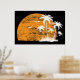 Tropical sun, palm trees and birds poster/print. A vector design, featuring a large orange sun behind white palm trees and birds on black background.