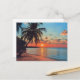 A serene tropical sunset with silhouetted palm trees set against a vibrant sky reflected over still waters.