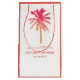 The design features a tropical watercolor palm tree in shades of warm coral pink, red and orange on a clean white background with colour coordinated editable wording.