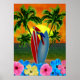 Tropical and colourful ocean sunset behind surfboards, palm trees, a macaw parrot perched on the surf boards, and hibiscus flowers at the bottom.