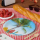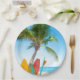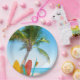 This design features colourful surfboards standing up in the sand with a palm tree, beach and ocean in the background.