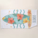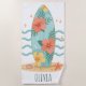 This personalised beach towel features a cute surfboard wrapped in soft, tropical hibiscus blooms in pink, coral, and yellow. Set against a breezy palette of ocean blues, sandy beiges, and seafoam greens, the gentle wavy accents add a calm coastal vibe.
