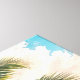 A curved palm tree with a swing hanging from it is situated on a sandy ocean beach