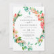 This tropical floral wedding invitation features a pretty watercolor floral wreath with tropical flowers, lush foliage, and sea shells. The flower wreath includes hibiscus and plumeria flowers in pretty shades of peach, coral pink, and blush pink. Emerald green and teal leaves also decorate the watercolor wreath. The back of the card is a lovely sunshine yellow. Matching wedding stationery is available in our Tropical Floral wedding collection.