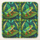 Tropical-themed coasters with vibrant green leaves