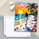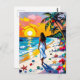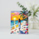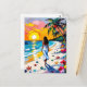 A sweet postcard letting a friend know you are thinking about them and checking in. The front has a beautiful ai illustration done in an oil painting impasto style. A woman walking on the beach among palm trees, tropical flowers, turquoise waves, sea glass and seashells.