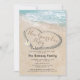 Tropical beach themed new years eve party invitation featuring the blue ocean shoreline, a heart carved in the sand, and a new year celebration template that is easy to personalise.