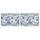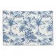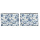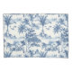 The image depicts a classic toile de Jouy pattern, chraacterised by detailed scenes in blue on a white background. It features tropical landscapes with lush palm trees, rocky terrain, and serene water bodies. There are elements such as small huts, birds in flight, and distant islands, giving the design an idyllic, peaceful feel. The pattern is intricate and evokes a sense of traditional, pastoral elegance often associated with French decorative arts.