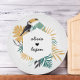 Elegant cutting board with a tropical frame with leaves and abstract toucan bird. This can be customised with a couple's names. The names are in a black script font. The background is white. The colour of the heart is editable by going into the design tool, selecting the heart layer on the left, and then clicking on the colour box on the right to bring down a colour chart.
