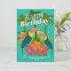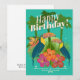Teal Background fun unisex Happy Birthday Card with a Tropical theme including palm trees, toucan birds, hibiscus flowers, palm leaves, and other tropical themed colours and illustrations.