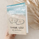 Beach wedding thank you note featuring a summer tropical island background, a vintage sandy beach with two hearts in the shoreline, your initials and a appreciation text template.