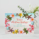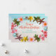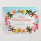 Warm Christmas greeting card with lots of plumeria flowers and sea stars that make a border around text. Customise with your choice of greeting and add a signature. An ocean beach is the background for this tropical holiday design, and it carries over to the back of modern, flat cards. Change the size if you wish and paper upgrades are offered.