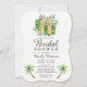 Tropical bridal shower invitation features watercolor starfish flip flops and palm trees.