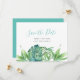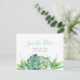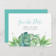Set in trendy script typography that mimics hand lettering, this simple yet sophisticated card includes your names, wedding date, and location. The reverse side features a complementary solid turquoise blue for a bold, tropical finish.