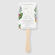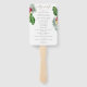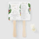 Wedding program fan with tropical design, tropical leaves, yellow & red floral, gold geometrics & calligraphy.