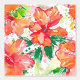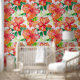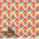 "Tropical Whimsy" is a seamless pattern in a watercolor style featuring vibrant orange hibiscus flowers with dark green leaves on a white background. The design is accented with paintbrush strokes in pink and light green, adding a whimsical and artistic touch. The elements are arranged fluidly, creating a harmonious and continuous pattern ideal for various applications such as textiles, wallpapers, and digital designs.