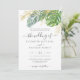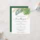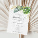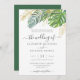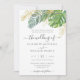 This elegant wedding invitation features a watercolor design of lush tropical leaves in shades of green. The leaves are accented with faux gold effect, which adds a touch of luxury. The text is printed in a stylish black calligraphy script font, which is easy to read against the white background. This invitation is perfect for a summer wedding or a destination wedding in a tropical location.