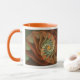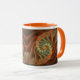 Mug with "Tropicanna" an abstract design by Susan Wallace. Copyright © 2009, Susan Wallace. Abstract design in shades of orange and green gives the impression of a tropical flower in the jungle. Full wrap-around design.
