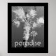 tropics poster black and white photograph of palm trees with text paradise in white letters available as 8 x 10 or 16 x 20 wall art. Original art and photography by Ann Powell on posters and wall art. Photograph copyright Ann Powell all rights reserved.