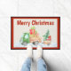 Fun Christmas doormat with vintage woodside truck pulling wagon with Christmas tree and presents.