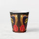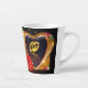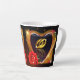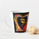 Beautiful latte mug with a printed image of an acrylic painting of two gold wedding rings inside a gold shaped heart with a red rose.
